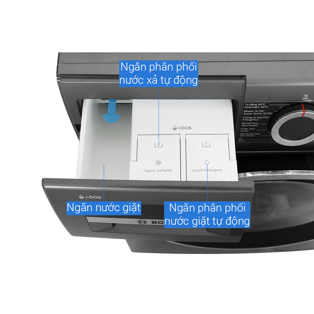 – Hệ thống phân phối nước giặt/nước xả trên Máy giặt Bosch WGG254A0VN sẽ giảm đáng kể nước giặt dư thừa, I-DOS không chỉ chăm sóc bạn mà quan tâm tới cả môi trường sống. Bằng cách kích hoạt chương trình tự động giặt I-Dos, tất cả các yếu tố liên quan đến quá trình giặt sẽ được điều chỉnh. Máy giặt Bosch chỉnh chính xác mức nước giặt theo lượng quần áo, loại vải và mức độ ngâm. Chỉ cần đổ 1 lần và sẽ tự động phân phối rửa lần sau