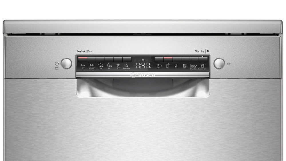 Sấy thêm – Extra Dry: Bát đĩa khi bạn lấy ra khỏi máy thường vẫn còn ướt. Đây là lý do tại sao Bosch lại cung cấp tính năng sấy khô Dry Extra. Nó sẽ làm tăng nhiệt độ của lần tráng cuối cùng và kéo dài thời gian sấy hơn. Nhờ đó, mọi vậy dụng đều được sấy khô hoàn hảo.